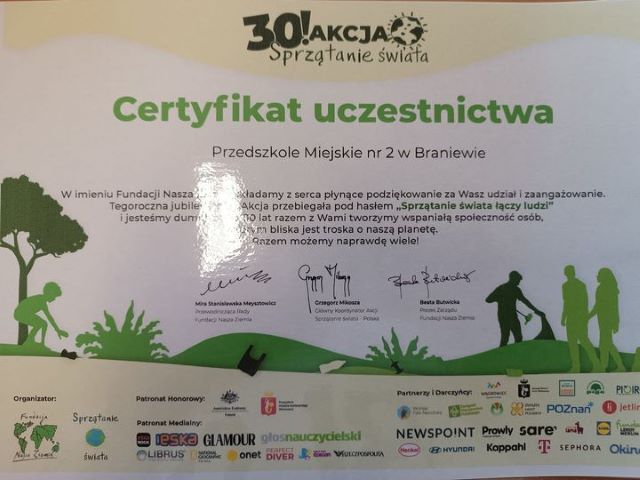 Nasze przedszkolaki wiedzą, że należy dbać o środowisko, dlatego otrzymaliśmy certyfikat uczestnictwa w 30! Akcji "Sprzątanie świata".